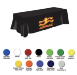 Polyester 6' fitted table cover. Painted polyester tablecloth, silk screen & dye sublimation with custom digitally imprinted. Full digital color wholesale tablecloths vinyl , table linen, runner, cover, throw, drape and painted fabric taffeta table cloth skirt for trade show event parties. Rectangular wipeable tablecloths, runners, covers, throws, logo skirts at discount sale. Colored sub table cloth fabrics cloths products for shows.